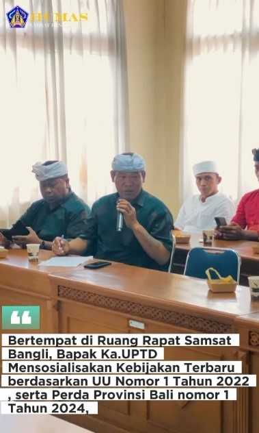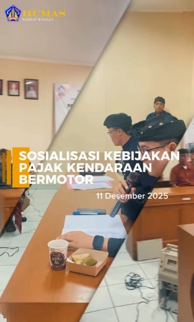 Bangli, 11 Desember 2025 – Samsat Bangli melaksanakan kegiatan Sosialisasi Kebijakan Pajak Kendaraan Bermotor Tahun 2025 yang dipimpin langsung oleh Bapak Kepala UPTD Pelayanan Pajak dan Retribusi Daerah Provinsi Bali di Kabupaten Bangli, didampingi oleh Bapak Kepala Seksi Penagihan dan Keberatan.